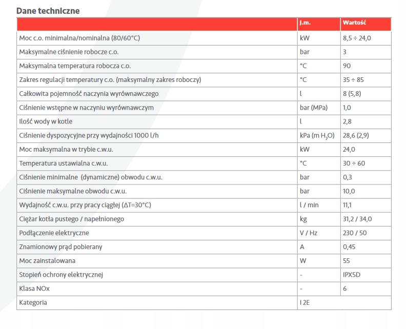 - Moc maksymalna c.w.u.: 24,0 kW