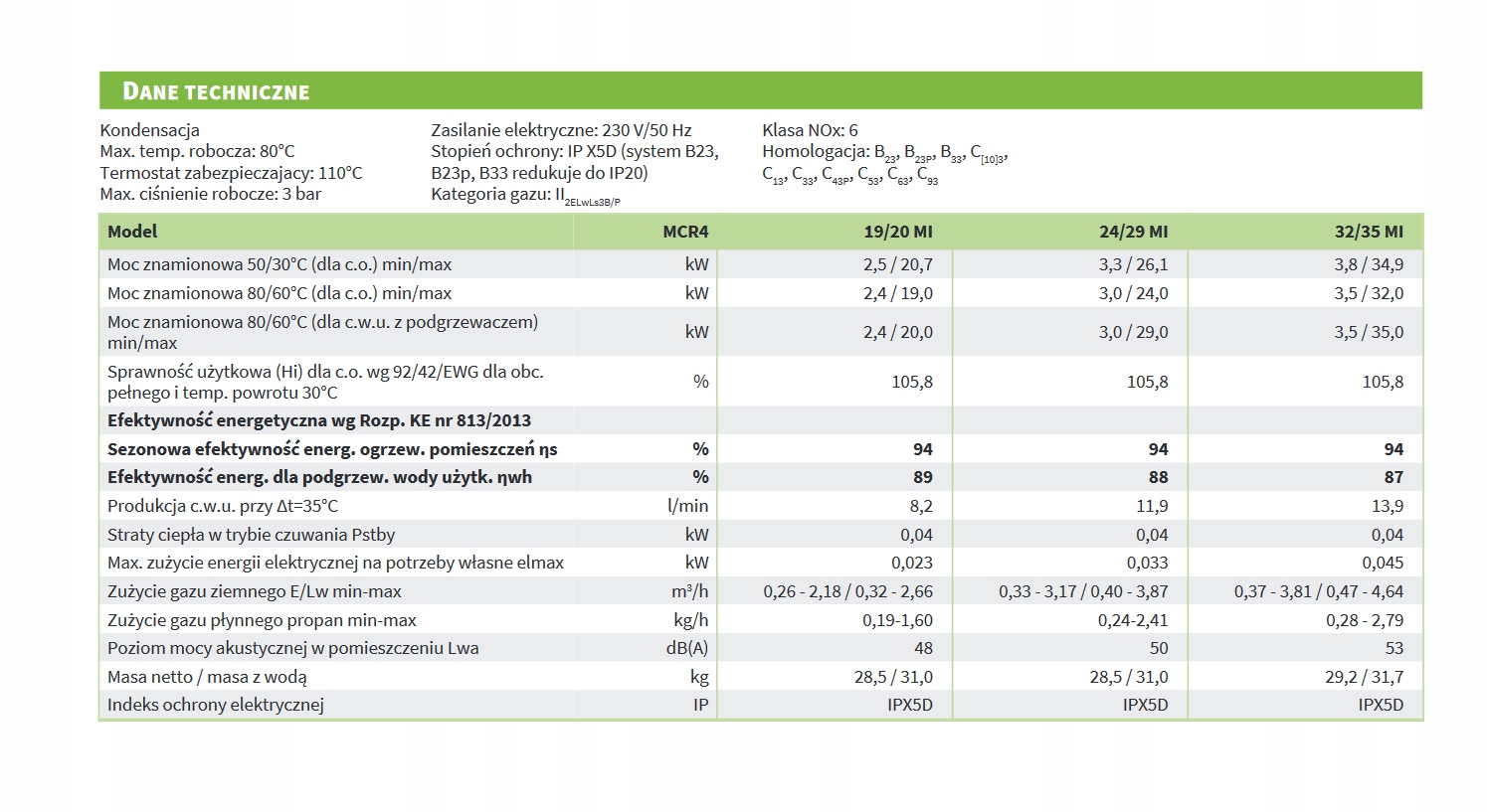 - Klasy energetyczne: A dla c.o. i c.w.u.