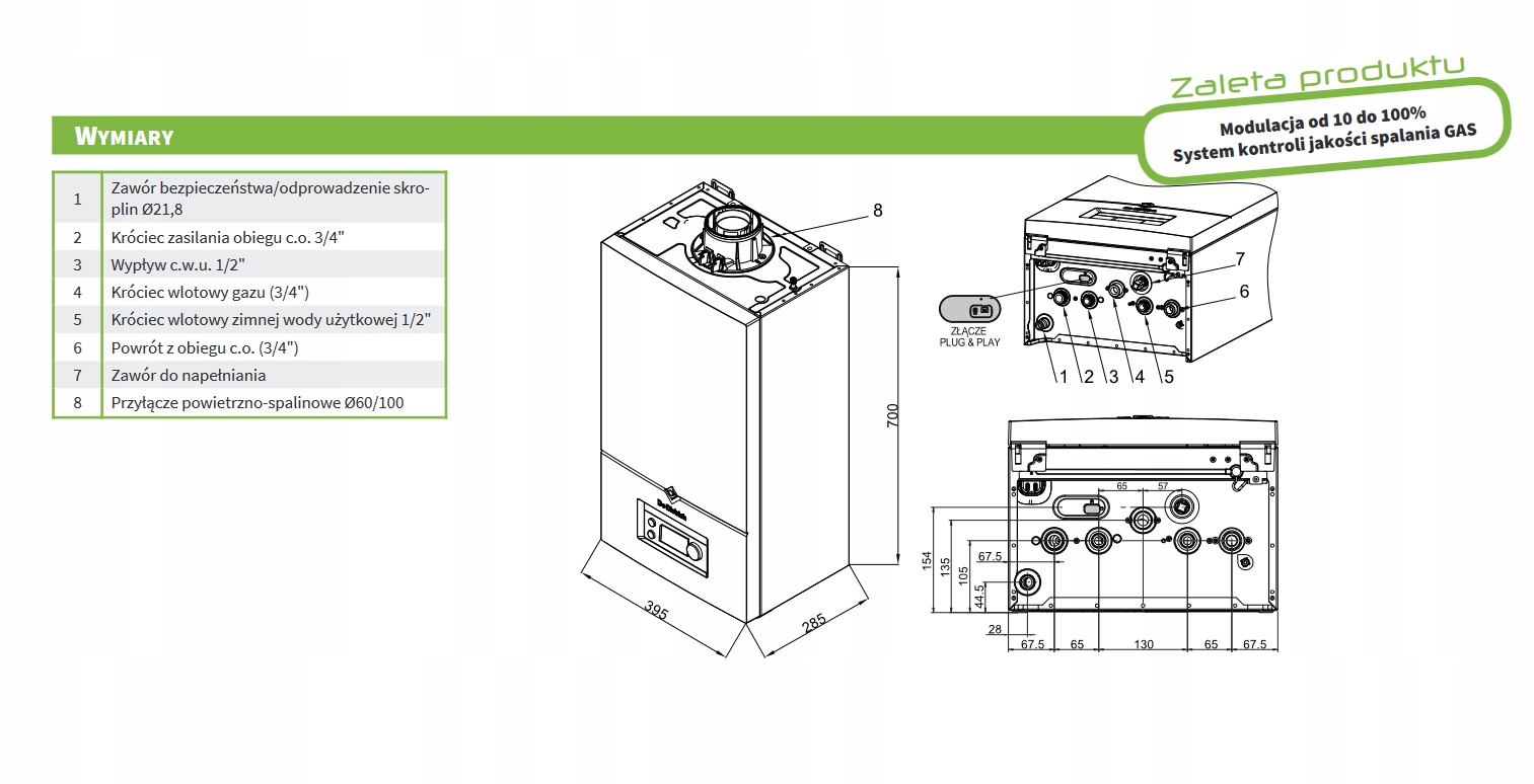 - Przyłącze powietrzno-spalinowe: Ø60/100 mm