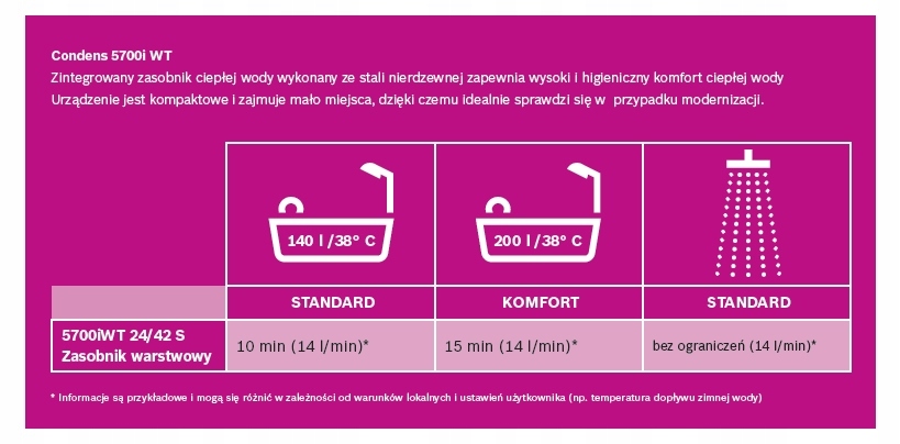 Condens 5700i WT to kocioł gazowy kondensacyjny nowej generacji, który łączy w sobie efektywność energetyczną, wygodę użytkowania oraz gotowość na przyszłe zmiany paliwowe (w tym wodór). Dzięki zintegrowanemu warstwowemu zasobnikowi ze stali nierdzewnej, urządzenie oferuje błyskawiczny i stały dostęp do ciepłej wody – nawet przy większym zapotrzebowaniu.